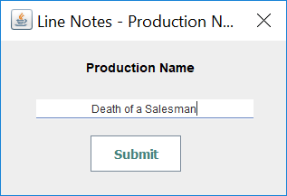 - Submit button: Press this button to enter the completed line note into the database of line notes. This button will also clear all of the text fields except for the Character Name filed.